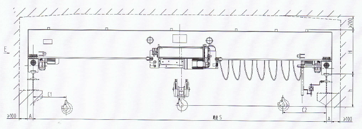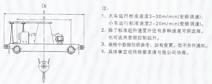單主梁,焊接箱形,拱度符合國家標準,鋼板材料為國內鋼材Q235B或Q345B,腹板由40m數控切割整幅下料,確保拱度曲線的光滑成型和精度,主焊縫采用埋弧自動焊、無損探傷,焊后整梁拋丸處理,達到Sa2.5級,消除焊接應力,環(huán)氧富鋅漆,兩底兩面,140μ厚,壽命長,外表美觀,光澤好。主梁與端梁采用10.9級高強度螺栓連接,確保整機結構強度和精度。大小車采用三合一驅動機構,變頻無級調速,硬齒面,盤式制動器。大車驅動IP55,F級絕緣,接電持續(xù)率達到40% ED。端梁配置平輪或雙輪緣車輪、抗磨軸承、大車緩沖塊、防脫軌端板。