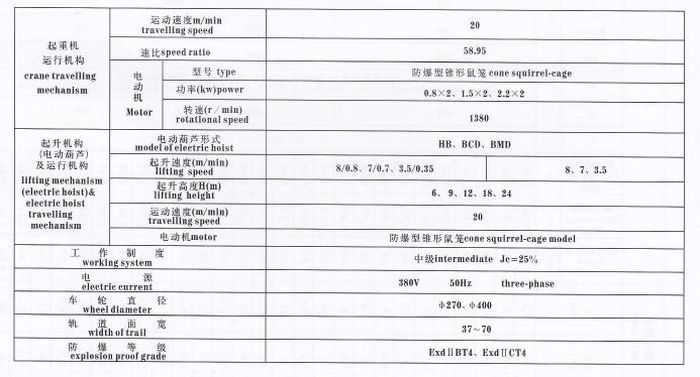 本起重機(jī)根據(jù)GB3836.1-2000《爆炸性氣體環(huán)境用防爆電氣設(shè)備**部分:通用要求》及GB3836.2-2000《爆炸性氣體環(huán)境用防爆電氣設(shè)備第二部分:隔爆型“d” 》的規(guī)定,電機(jī)、電器為隔爆型,防爆級(jí)別為ExdIICT4時(shí),運(yùn)行機(jī)機(jī)構(gòu)進(jìn)行防火花處理。整機(jī)符合JB/T10219-2O01《防爆梁式起重機(jī)》的規(guī)定,防爆等級(jí)分別為ExdIIBT4、ExdIICT4。具有結(jié)構(gòu)合理、外形美觀、防爆性強(qiáng)的特點(diǎn)。整機(jī)與HB、BCD型防爆電動(dòng)葫蘆配套使用。其*大起重量為63t。防爆梁式起重機(jī)共有三種形式:1、LXB防爆電動(dòng)單梁懸掛起重機(jī)。2、LB防爆電動(dòng)單梁起重機(jī)。3、LHB防爆電動(dòng)葫蘆橋式起重機(jī)。工作級(jí)別為A3-A4,工作環(huán)境溫度為-25℃ ~40℃ 。歡迎來電垂詢??!