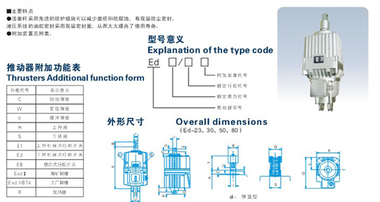 ED電力液壓推動器主要用途是作為電力液壓塊式制動器的驅(qū)運裝置,也可通過杠桿機械完成往復(fù)、圓周、擺動等形式的快速運動,適用于起重、運輸、冶金、礦山、港口、建筑等行業(yè)。