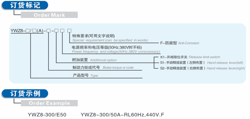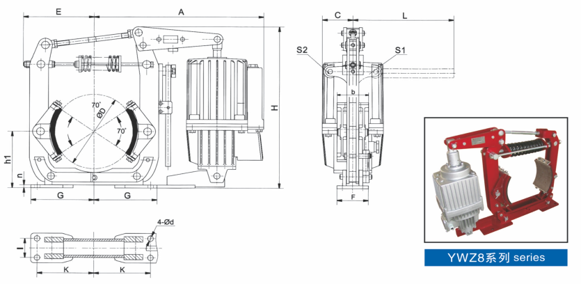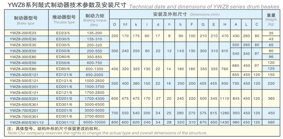 YWZ8(A)系列電力液壓鼓式制動(dòng)器連接尺寸和制動(dòng)力矩參數(shù)符合JB/ZQ4388-86和GB6333-86(帶A系列)標(biāo)準(zhǔn),技術(shù)要求符合JB/T6406-2006標(biāo)準(zhǔn),配套符合DIN15430標(biāo)準(zhǔn)的ED推動(dòng)器;