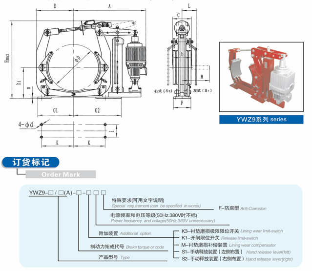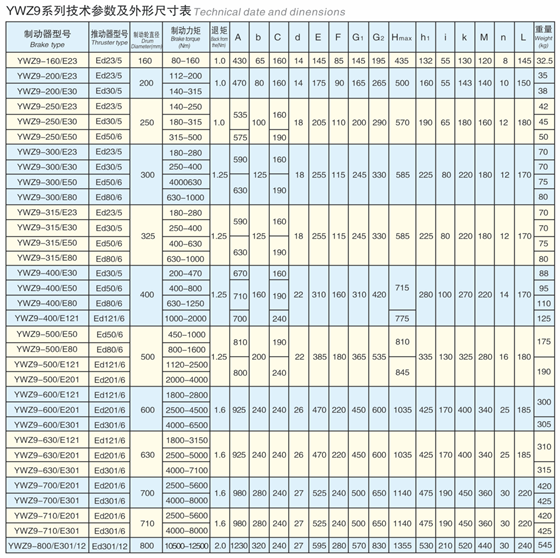 YWZ9系列電力液壓鼓式制動器連接尺寸和制動力矩參數(shù)符合GB6333-86及JB/ZQ4388-86(帶A系列)標準,技術(shù)要求符合JB/T6406-2006標準,配套符合DIN15430標準的ED推動器。